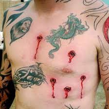 tattoo that resembles a wound and blood was evident.